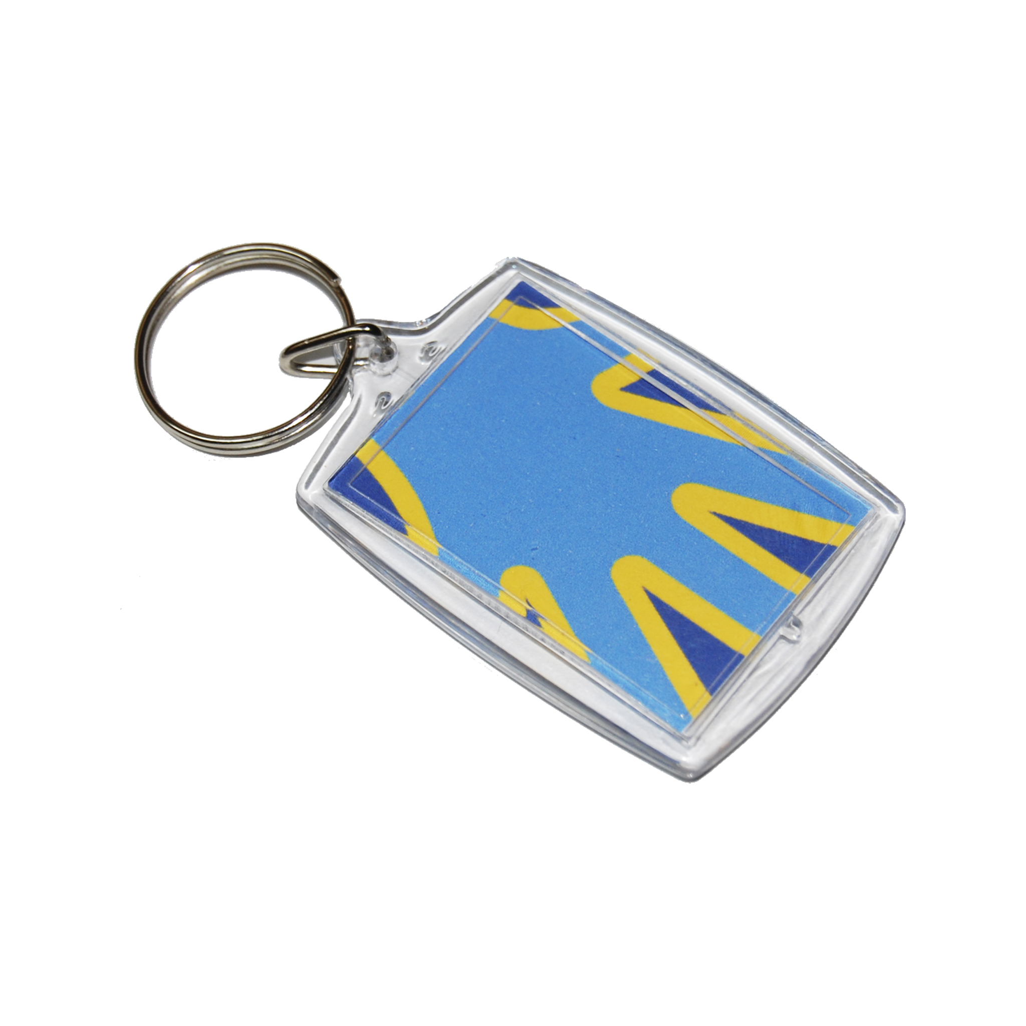 Clauer d’acrílic i fotografia amb colors blau turquesa i groc.